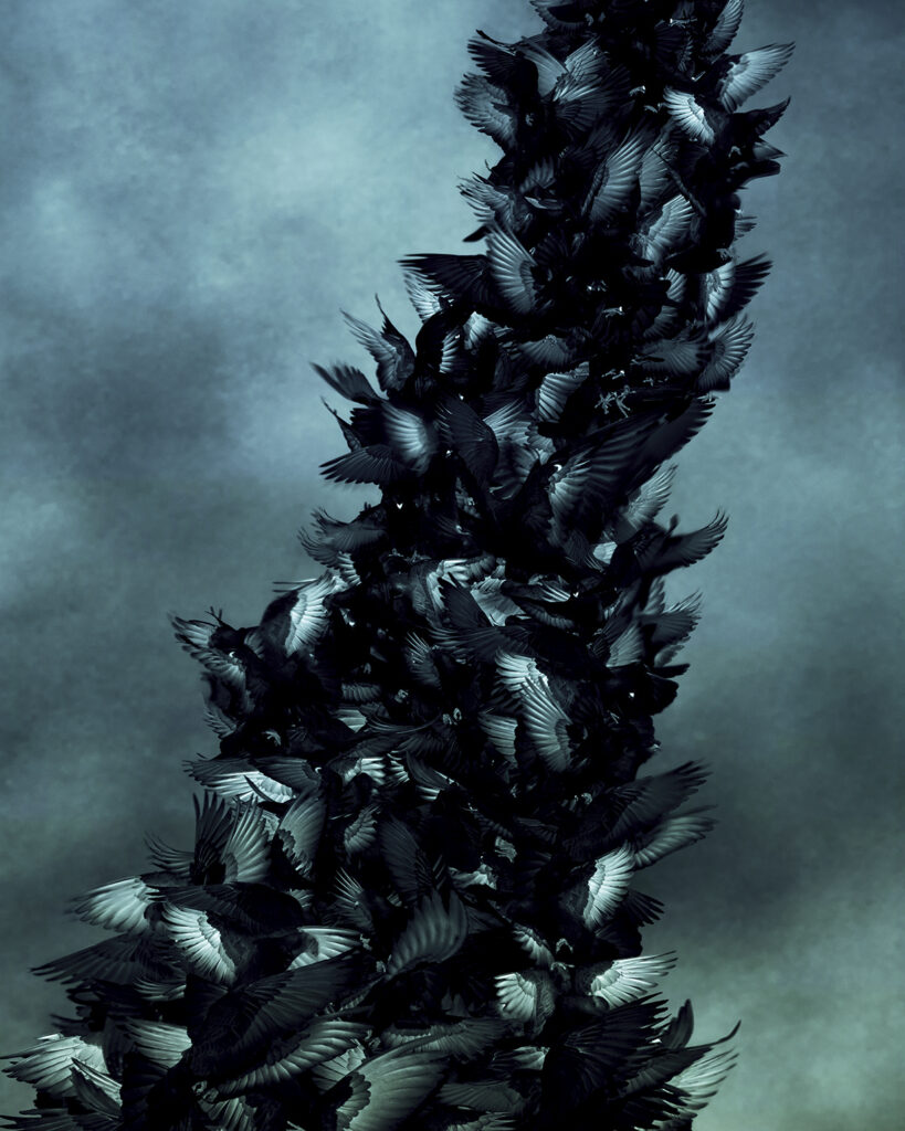 “Changing of the Guard” is an inkjet print from the series “Gospels”. Using footage filmed in early 2023 in southern Israel, it depicts homing pigeons forming a dilapidating structure against a smoky backdrop. They seem to melt into one another, and it remains ambiguous whether they are rising or dropping.