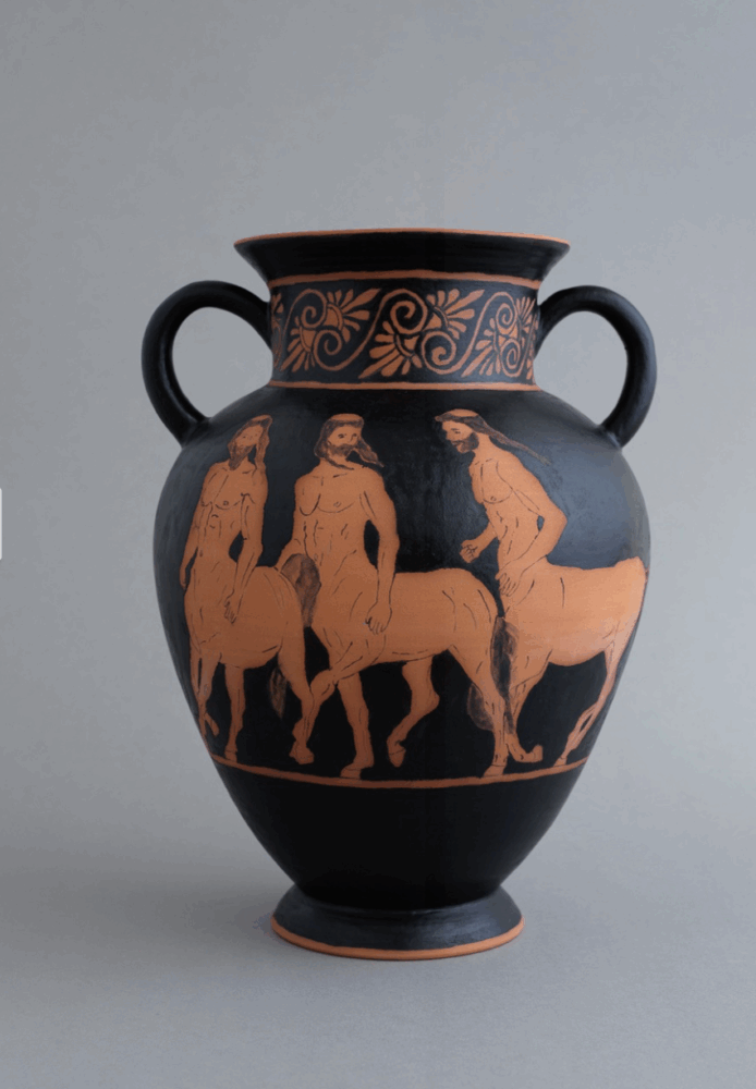 In 2023, artist Didi Khalifa began creating, in collaboration with ceramicist Noa Platt, a series of vases in the ancient Greek style of “red-figure pottery,” dated to 530 BC. In this technique, the background of the pottery is black while the depicted figures are red. Khalifa used classical vase shapes, including various types of amphorae for wine or oil, a lekythos for pouring oil in ceremonies, and a kylix bowl for drinking wine at banquets. He applied classical decorative elements to the vessels and adorned them with figures of centaurs:creatures from Greek mythology with the upper body of a human and the lower body of a horse, who are associated with a wild, untamed and violent nature.