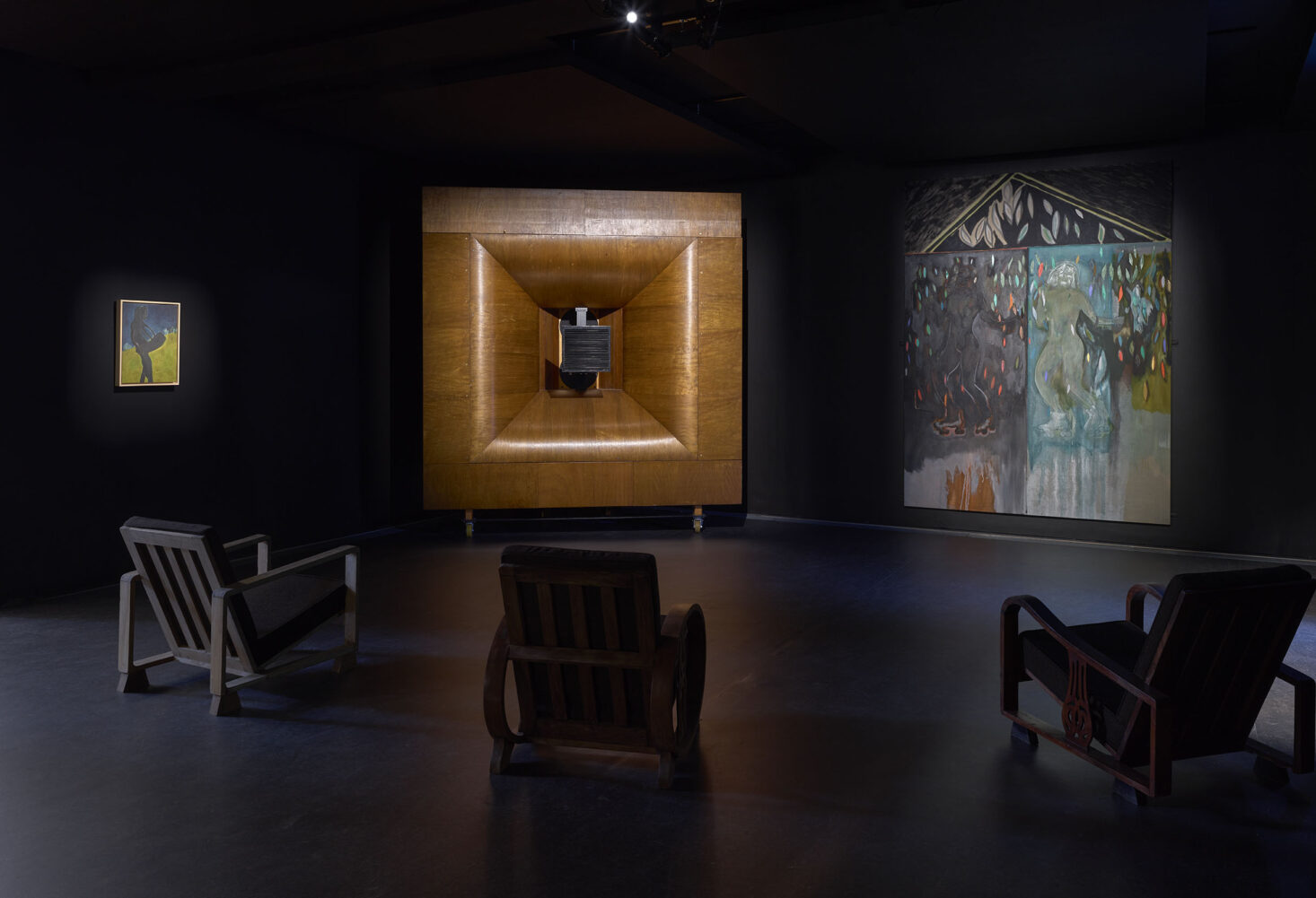 Transforming the gallery into a listening space, House of Music brings together recent paintings and, for the first time, integrates sound into Doig’s work. The exhibition features two sets of rare, restored analogue speakers, originally designed for cinemas and large auditoriums. Music selected by the artist (from his substantial archive of vinyl records and cassette tapes accumulated over decades) plays through a set of ‘high fidelity’ 1950s wooden Klangfilm Euronor speakers. Each painting in the exhibition engages with music in a different way: some depict spaces where music is played or heard, others show musicians performing or people dancing.